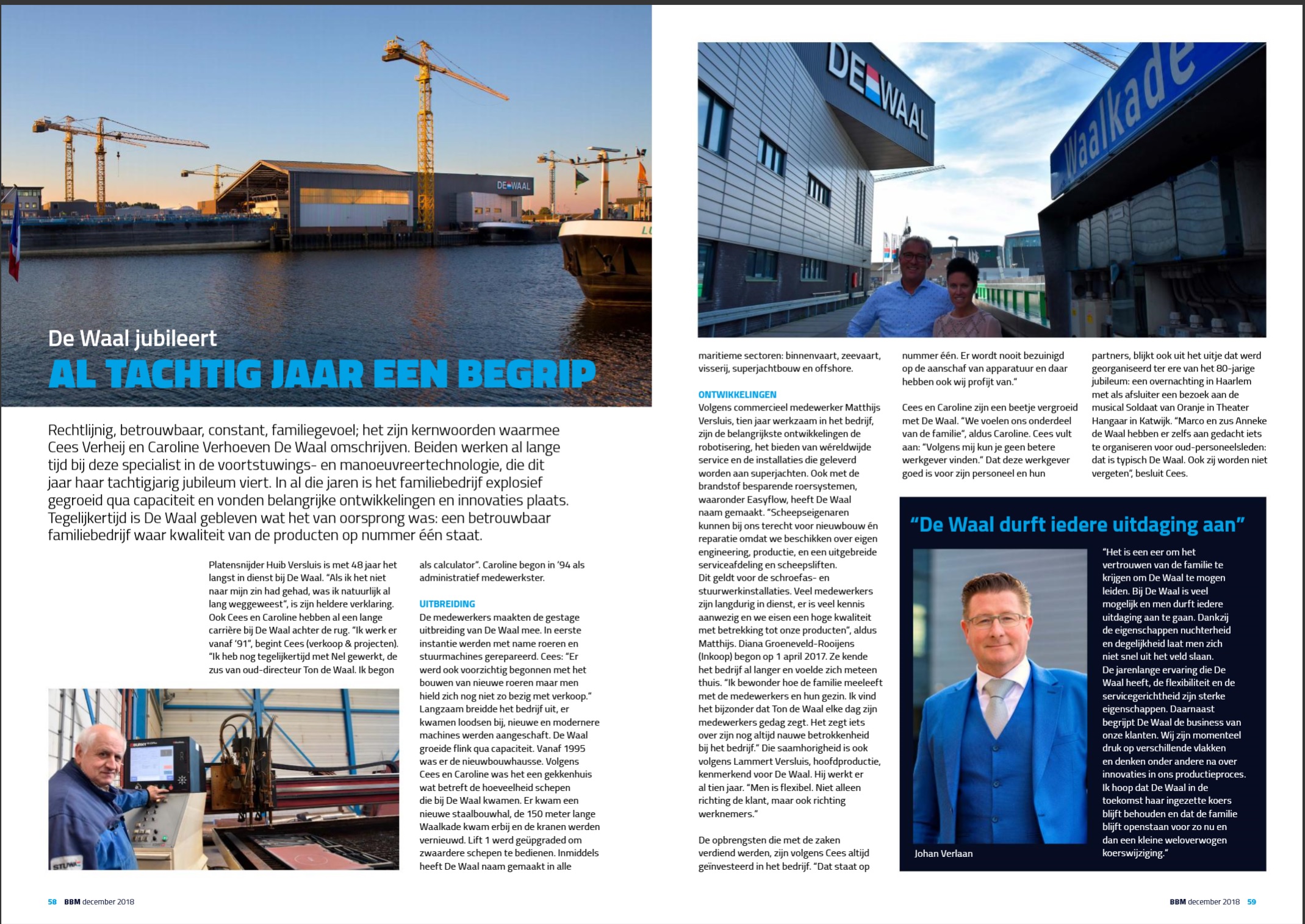 Dit jaar is het alweer tachtig jaar geleden dat Ko de Waal zijn machinefabriek in Werkendam begon en dat is dan ook uitgebreid gevierd, onder andere met diverse publicaties in verschillende media. Zo besteden de decembernummers van BBM Magazine en de Scheepvaartkrant uitgebreid aandacht aan ons mooie jubileum.
