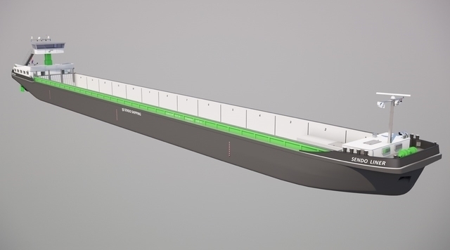 De Sendo Liner wordt een zeer zuinig containerschip van 110 x 11,4 meter. Een dubbelschroefs model dat 32 procent minder vermogen heeft bij dezelfde diepgang (3,2 meter), snelheid (14 km/h en 3,89 m/s) en waterdiepte onder de kiel (1,5 meter) als het ms Nadorias. Dit is een bestaand schip van Sendo Shipping aan de hand waarvan deze data in kaart zijn gebracht.