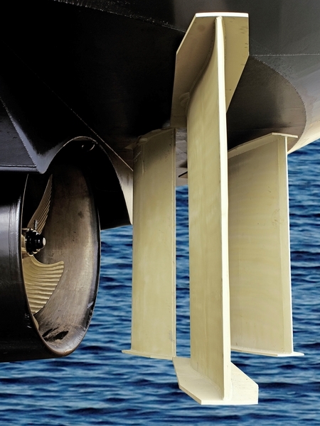The triple rudder system always consists of three rudders per propeller. Two virtually identical, mirrored outer rudders and a relatively small, short centre rudder between them. Placing three rudders behind a single propeller improves efficiency and manoeuvrability.